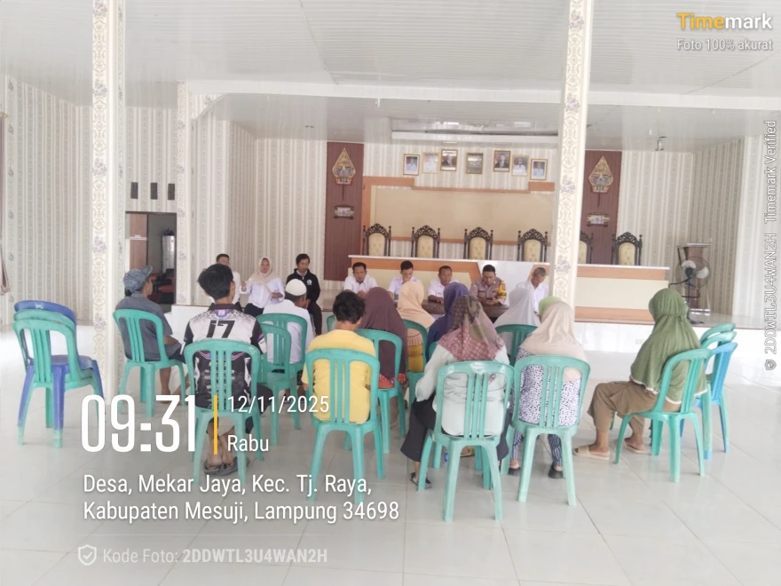 Pemerintah Desa Mekar Jaya melaksanakan kegiatan pembagian Bantuan Langsung Tunai (BLT) Dana Desa tahap 4 tahun 2025 kepada masyarakat yang berhak menerima. Kegiatan ini berlangsung di Balai Desa Mekar Jaya dan dihadiri oleh Kepala Desa beserta perangkat desa, pendamping desa, dan Bhabinkamtibmas.