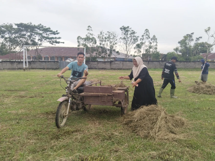 Semangat kebersamaan aparatur Desa Mekar Jaya dalam rangka kegiatan pembersihan lingkungan lapangan menjelang HUT Mesuji ke-17.