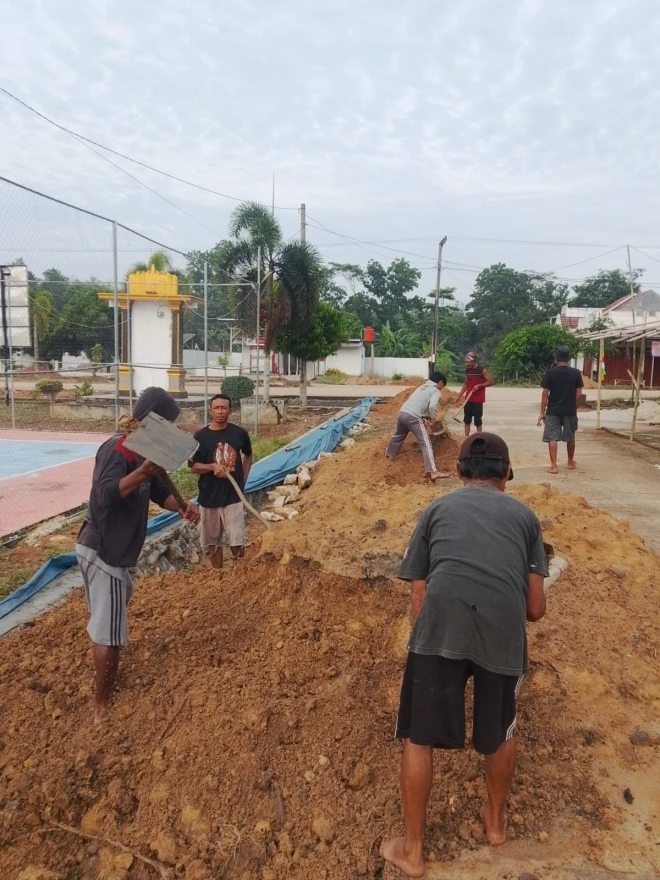 Sejak pagi, warga dan aparatur desa bahu-membahu membersihkan lingkungan, merapikan rumput, memperbaiki beberapa fasilitas yang rusak, serta menata area lapangan agar terlihat lebih rapi dan nyaman. Suasana kerja bakti berlangsung penuh antusias dan kekompakan, mencerminkan nilai-nilai kebersamaan serta kepedulian terhadap lingkungan.