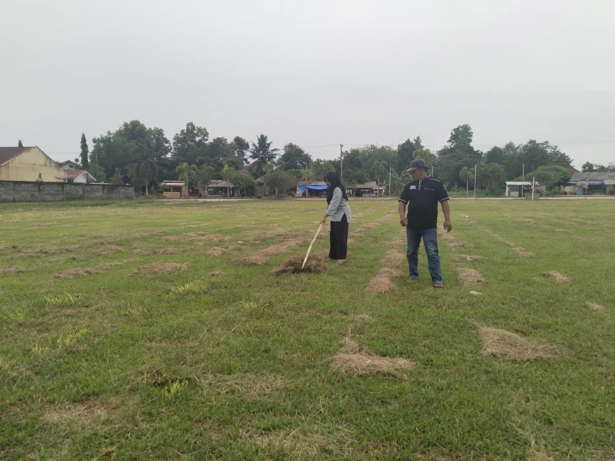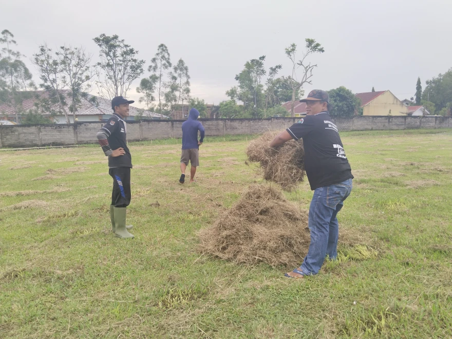 Semangat kebersamaan aparatur Desa Mekar Jaya dalam rangka kegiatan pembersihan lingkungan lapangan menjelang HUT Mesuji ke-17.